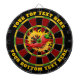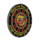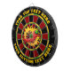 Dark red, black, green and yellow dartboard design. Each colour is customizable. Hot pepper in flame circle. Two custom text areas on outer ring.