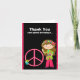 End your celebration off with this adorable girls' hippie birthday thank you card. it has a large hot pink peace sign with coloured flowers on the side of it. Next to it is a cute girl with long brown hair. She has a coloured tie dye shirt with matching headband. There's a hot pink border with white polka dots around a black centre. Check out the many other designs and products in this line. ©JW Illustrations