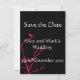 This hot pink and black save the date card really pops with the pink butterflies and branches with little buds against the dark black background.