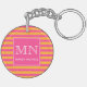 NewParkLane - Colourful personalized keychain, with a fun, summery pink and orange striped pattern, and a hot pink frame for your name and monogram. Easy to customize in Zazzle with your own text for a personalized design. All text style, colours, sizes can be modified to fit your needs.