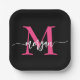 Hot Pink Black Modern Script Girly Monogram Name Paper Plate