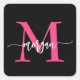 Hot Pink Black Modern Script Girly Monogram Name Square Sticker