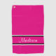 This design has a solid background colour of hot pink with hot pink, black and white stripes. The name is in a script font and can be customized using the template field.