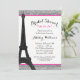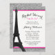 Glamourous Paris themed bridal shower invitations. Shown in hot pink and black. Featuring an Eiffel tower illustration with a faux silver glitter background. Designs are flat printed graphics - NOT ACTUAL GLITTER. Graphics by JW Illustrations