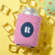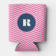 Modern and stylish monogram can cooler featuring hot pink herringbone pattern with navy blue round tag. This will be perfect as a personalized gift. This design is available in a variety of colours and products.