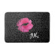 A trendy pink and black bathmat featuring a hot pink lipgloss kiss print against a black leopard print background. Personalize this girly design by adding your monogram initials.