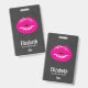 Personalized name badge with an illustration featuring hot pink lips. Bold and vibrant image. Set on a black mottled background.