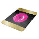 A bath mat with an illustration featuring hot pink lips. Bold and vibrant image. A faux gold gradient border along the sides. Set on a black background.