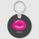 A key chain with an illustration featuring hot pink lips. Bold and vibrant image. Set on a black mottled background.