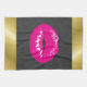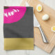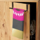 A kitchen towel with an illustration featuring hot pink lips. Bold and vibrant image. Set on a black mottled background. The top and bottom border have an image of a gold gradient border.