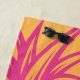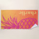 Beach towel featuring a hot pink pineapple and your custom name or text aligned vertically to the right on a yellow to orange gradient background.