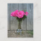 A postcard featuring a photo of a hot pink rose bouquet in a vase sitting on the ground in front of a barn.
