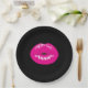 Paper plates with a drawing of a pair of shiny pink feminine lips on a black background.