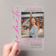 Acrylic graduation party invitation personalized with a photo of the graduate, with their name and the name of their school and the year above the photo, and the graduation celebration invitation wording beneath in elegant black and hot pink letters. Graduate is written along the side of the transparent acrylic graduation party invite in a hot pink signature script. Celebrate your graduate! Invite friends, family friends, and neighbours with this stylish acrylic graduation party invitation with black and pink text and a transparent background.