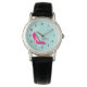 A personalized watch with a hot pink stiletto shoe. Set on a mint green watercolor background. Chic and glamourous.