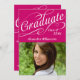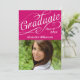 Bright hot pink fuchsia background with white swirly girly script text with "graduate", and a custom year, great for the graduate to announce the big achievement. Celebrate on the back with custom event text for your guests.