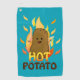 Fun cartoon brown potato with a big happy smile, dots for eyes and sticks for arms. He is surrounded by yellow and orange hot burning flames. Below him in orange and yellow text is the word HOT and below that in brown text is the word POTATO. Fun quirky design for a laugh.