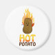 Funny brown potato with a happy face and flames coming out of his top half. Below are the word Hot Potato.