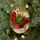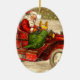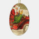 vintage Christmas oval tree ornament: Santa Claus cruising through the snow in his shiney red Santa mobile loaded with gifts