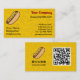 Cartoon illustration of hotdog. Junk food outline icons yellow pattern background. Custom text.