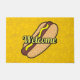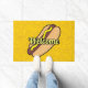 Cartoon illustration of hotdog. Junk food outline icons yellow pattern background. Custom text.