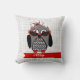 A pillow featuring an illustration of a grey and black owl with a houndstooth belly and red feet. Owl is wearing a red and black fascinator hat and red cat eye sunglasses. Personalize with your name. Opposite side is houndstooth.