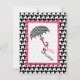 A baby shower invitation featuring a black and white houndstooth background and sheer centre section outlined in hot pink on front and back. Front features illustration of a houndstooth print umbrella with pink bow on handle. Text "Baby Shower" hangs from handle. Personalize the opposite side with details of your occasion.