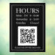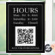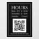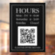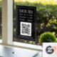 Hours Open Sign with QR code for store entry door or window in white text on black background with QR code message.