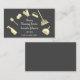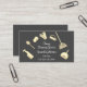 The cleaning service business card is decorated with gold-coloured cleaning supplies. Best for commercial or residential services for cleaning, housekeeper, maid service, home services, as well as janitorial supplies. florenceK design