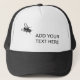 A silhouette image of a house fly insect against the white background and a customizable template text. You can change or delete the text. Funny one-of-a-kind trucker hat for anyone. Use the Customize button to reposition the fly, delete or add something. Have fun.