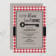 Trendy and cute red gingham and kraft paper design with a classic skeleton key for these home sweet new home, housewarming party invitations