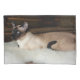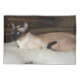 Chat siamois de point de joint maintenant chaud sur la couverture de jet de la laine d'un agneau blanc de faux sur le divan. Elle s'étend ainsi assez avec sa queue courbée et ses yeux bleus renversants.