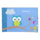 Adorable, oreiller personnalisé pour un garçon avec un grand hibou souriant assis sur une branche aux formes géométriques pour les feuilles. Nom personnalisable ou tout texte que vous souhaitez.
