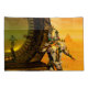 Image de science-fiction artistique et brillante en jaune, vert, marron, blanc. Titan cyborg d'Hyperion avec sa carapace métallique chromée vibrante dans un environnement surréaliste avec pyramides, soleil chaud, désert semblable à un paysage égyptien, cadre d'animation du film 3D Hyperion World .Baldesign3d (c)