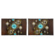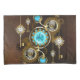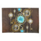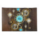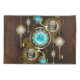 Turquoise lenses with antique watch with brass gears and golden keys on rusty, brown background. Steampunk style.
