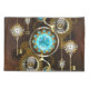 Turquoise lenses with antique watch with brass gears and golden keys on rusty, brown background. Steampunk style.