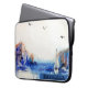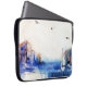 Waterfront aquarelle art intitulé "Misty Morning" sur une grande manche d'ordinateur portable de MHamilton Art dispose d'un voilier en partance avec des bâtiments dans l'arrière - plan. Les couleurs sont bleues et bronzées sur le blanc. Design abstrait nautique aquatique. Customise-le.