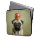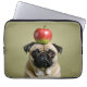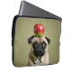 Carlin drôle avec une pomme équilibrant sur le dessus de sa tête.