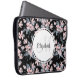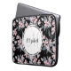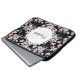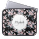 Manches personnalisées pour ordinateur portable avec un élégant motif fait avec une aquarelle illustration de fleurs roses avec feuilles et tiges bleu-gris. Arrière - plan noir classique. Un cercle blanc superposé avec votre nom et votre monogramme initial à l'intérieur.