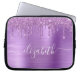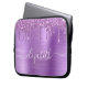 Manche monogramme chic et girly pour ordinateur portable avec des gouttes de parties scintillant violet sur un arrière - plan métallique violet faux brossé. Personnalisez avec votre nom dans un élégant script blanc tendance avec des swashes.