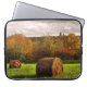 Cette douille d'ordinateur portable de photographie de beaux-arts présente un beau paysage d'automne dans des couleurs saisonnières de feuillage d'automne de rouge, d'orange, de jaune, de brun et de vert. Une tempête a passé et le soleil traverse les nuages sur un champ fauché avec les balles rondes de foin.
