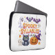 A festive Halloween-themed illustration featuring the phrase "SPOOKY SYLLABLES" in large, orange and purple gradient letters. Surrounding the text are various cartoon characters and objects: a cheerful white ghost, two hanging happy bats, an adorable black cat, a smiling jack-o'-lantern with a carved face and a purple witch hat on top, skulls, bones, and candy corn pieces. The background is dark with scattered star sparkles.