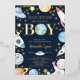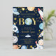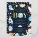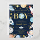 Gold Foil baby boy shower invitation featuring an astronaut, rocket ships, planets & stars set on a dark blue background. Flip our cute boys invitation over to view a coordinating shooting star back. Visit our shop for our entire line including matching diaper raffle & book cards.