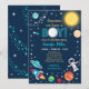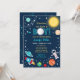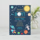 This cute invitation features an astronaut, rocket ship, sun and star background.
