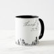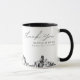 Modern Houston skyline coffee mug favour gift with "thank you" script. The design showcases a stunning sketch with the ability to customize your names and exact location. Enter the Zazzle design tool for additional customizations.