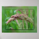 A macro shot of a flower of grass sprinkled with water droplets, the seeds turning the tip purple against a backdrop of rich green. Framing the photo is a glass mosaic of the field around it.