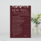 Celebrate the bride-to-be with this elegant How Well Do You Know the Bride bridal shower game. Designed in rich burgundy tones with romantic floral accents, this fun and interactive game lets guests test how well they know the bride. Perfect for bridal showers, bachelorette parties, engagement celebrations, and wedding events. A beautiful keepsake and a great ice-breaker that coordinates perfectly with floral and burgundy bridal shower décor.