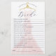 Fun & stylish how well do you know the bride shower game card? Fun game to play at your bridal shower party. Elegant blush pink shimming dress with gold vintage hanger displayed in the background. Original artwork and design By Moodthology Papery.