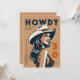 A fun 30th birthday party invitation template for women with a retro Western theme, featuring a poster style sketch of a beautiful woman wearing a cowgirl hat, in a flirty pose, with the title "howdy 30", with a desert colour scheme of black, terracotta and orange. A fun 30th birthday invite for a woman on her thirtieth birthday.