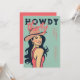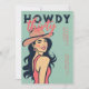 A fun 30th birthday party invitation template for women with a retro Western theme, featuring a poster style sketch of a beautiful woman wearing a cowgirl hat, in a flirty pose, with the title "howdy 30", with a vintage pink, green and navy colour scheme. A fun 30th birthday invite for a woman on her thirtieth birthday.